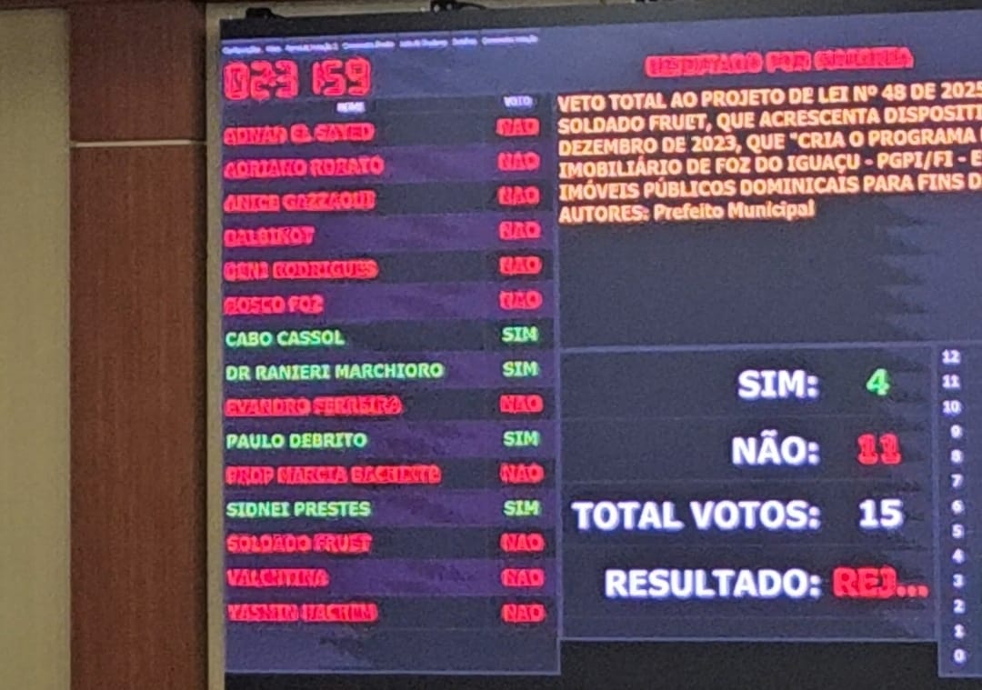 Na sessão desta terça-feira (19), os vereadores de Foz do Iguaçu derrubaram o veto do prefeito Joaquim Silva e Luna ao projeto de lei que determina a obrigatoriedade de realização de audiência pública antes da venda de áreas públicas do município.