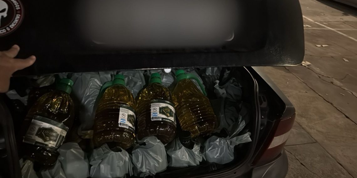 Entre os produtos apreendidos estavam galões de azeite argentino de cinco litros, cuja comercialização é proibida pelo Ministério da Agricultura e Pecuária, devido à origem clandestina e ao risco sanitário.